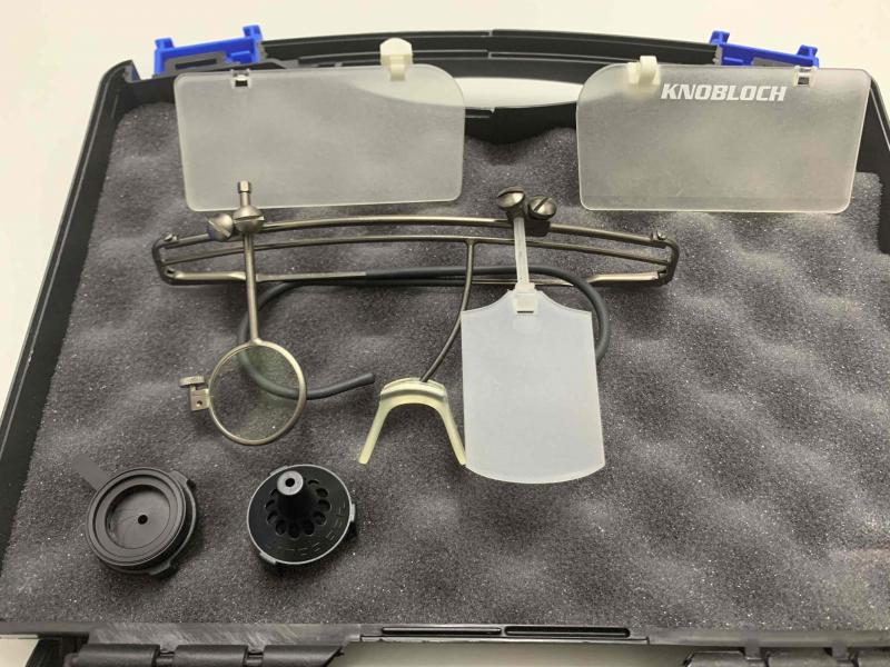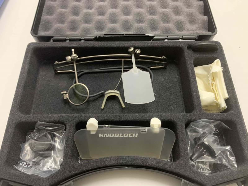 Viene con el aro pequeño de 23 mm e incluye tapaojos traslúcido, diópter knobloch, centrador y protectores laterales, además de su maletín original con la llave de ajuste.