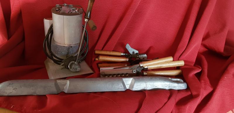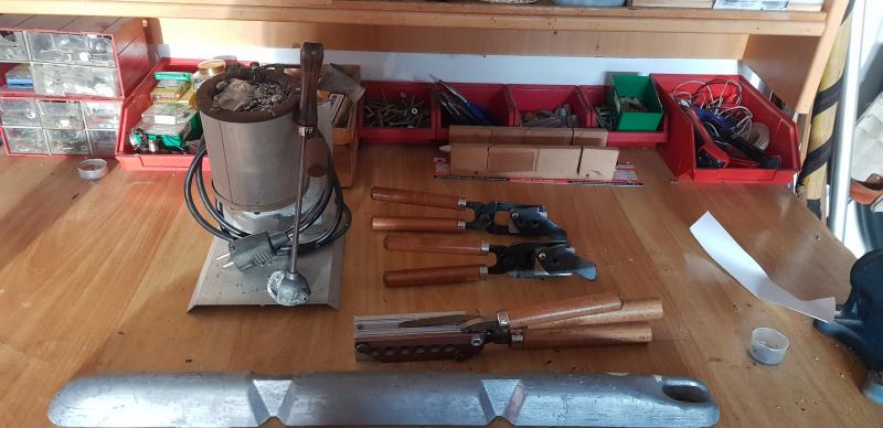 80 kg de plomo de linotipia en barras. Turquesas de 9 de un molde, de seis y de bala de escopeta. Hornillo para fundir. Cuchara para dispensar el plomo fundido. Máquina de recargar cartuchos de escopeta. Todo 500 €.