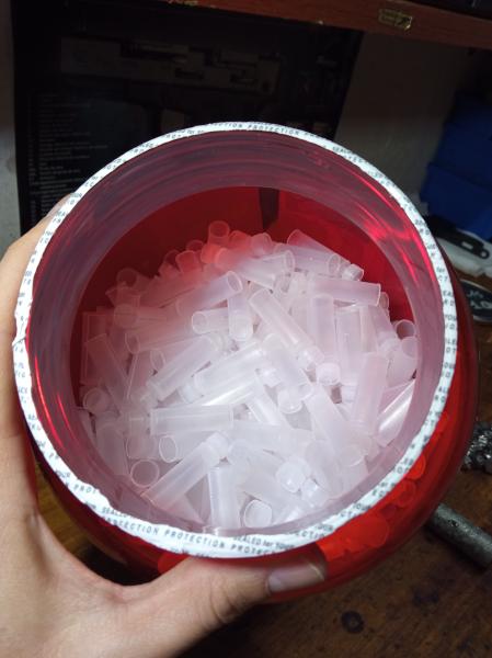 Unos 200 tacos cortados y preparados para atornillar a la bala y que haga de veleta (Como las Brenneke) y sus tirafondos muy finos.