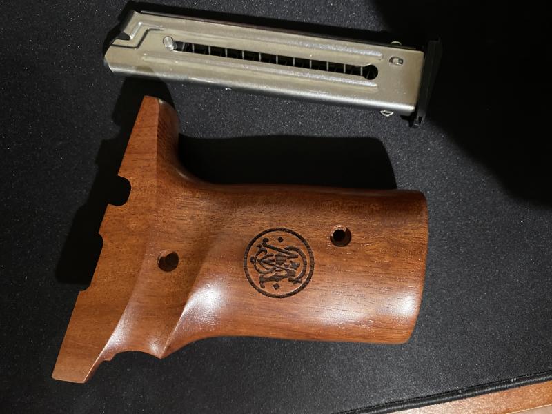 Se vende o cambia,empuñadura original en madera nueva y 1 cargador S/W 22A