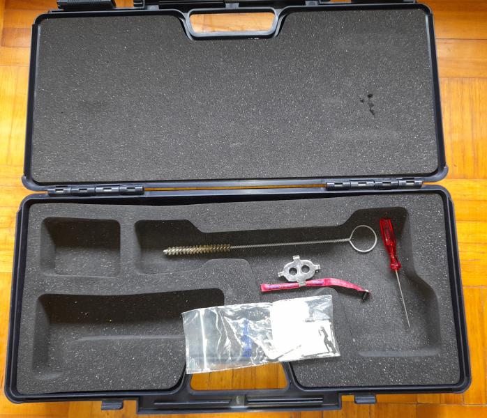 Maletin para pistola Walther GSP, con baqueta, testigo de arma descargada, llaves, un punto de mira y dos alzas.