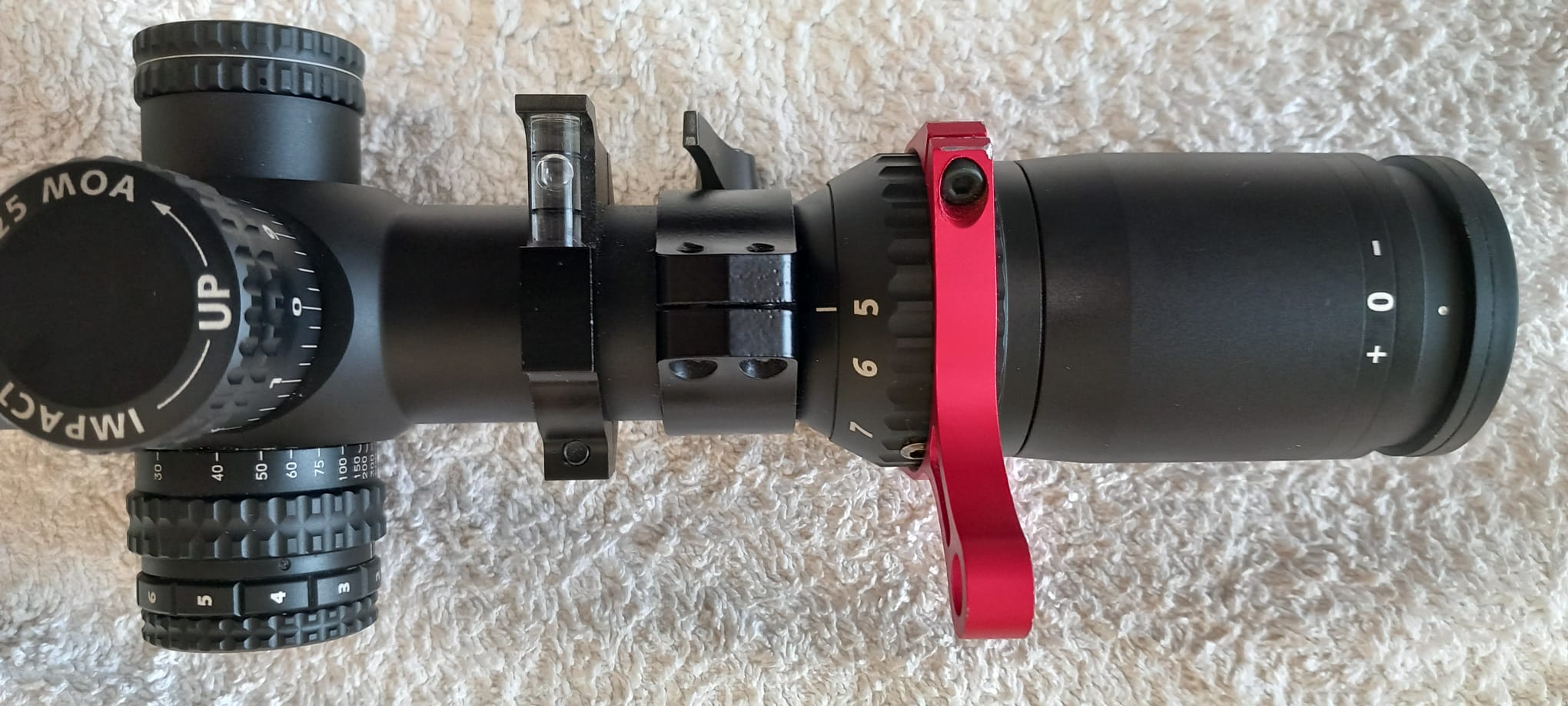 Retícula moar iluminada, nivel y palanca para variar los aumentos. Anillas Warne máxima desmontables.