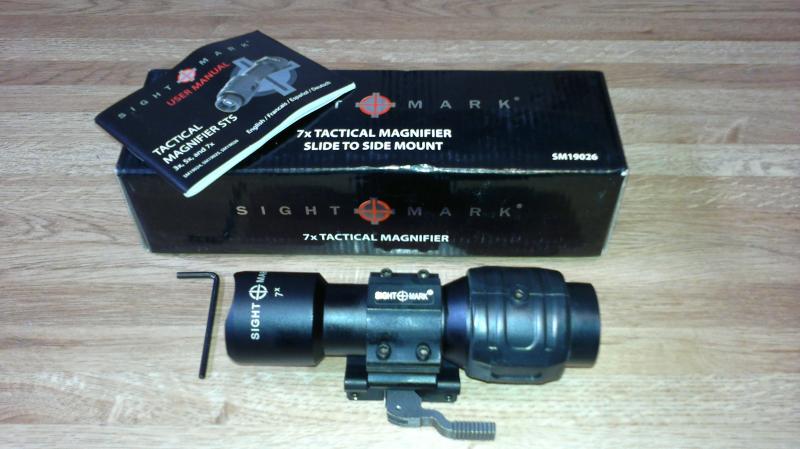 En esta ocasión vendo, por proceder de un regalo y ya tener uno similar :( , un magnificador de 7 aumentos (sí, 7) para visores de punto rojo u holográficos. Se trata de un visor Sightmark STS, y sólamente ha sido montado en sus anillas e instalado en un rail picatinny para tomar las fotografías que acompañan a estas líneas.