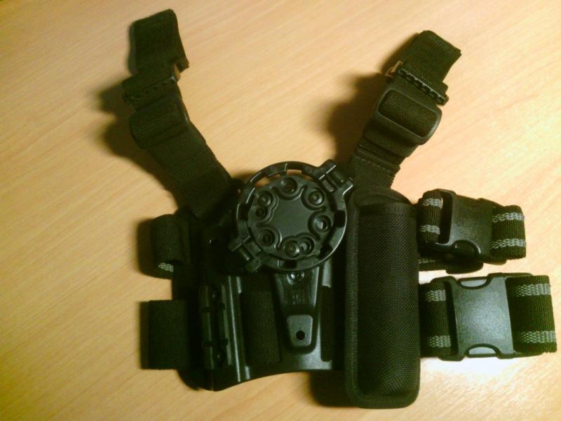 Permite portar, junto al arma, accesorios adicionales mediante el uso de las fundas del mismo fabricante (en la fotografía incluye un rail para el uso de los cargadores de polimero de BLACKHAWK, así como una funda para una defensa telescópica ASP; ambos accesorios se entregan junto con la funda, además de otros adaptadores que añaden flexibilidad en la configuración del arnés).