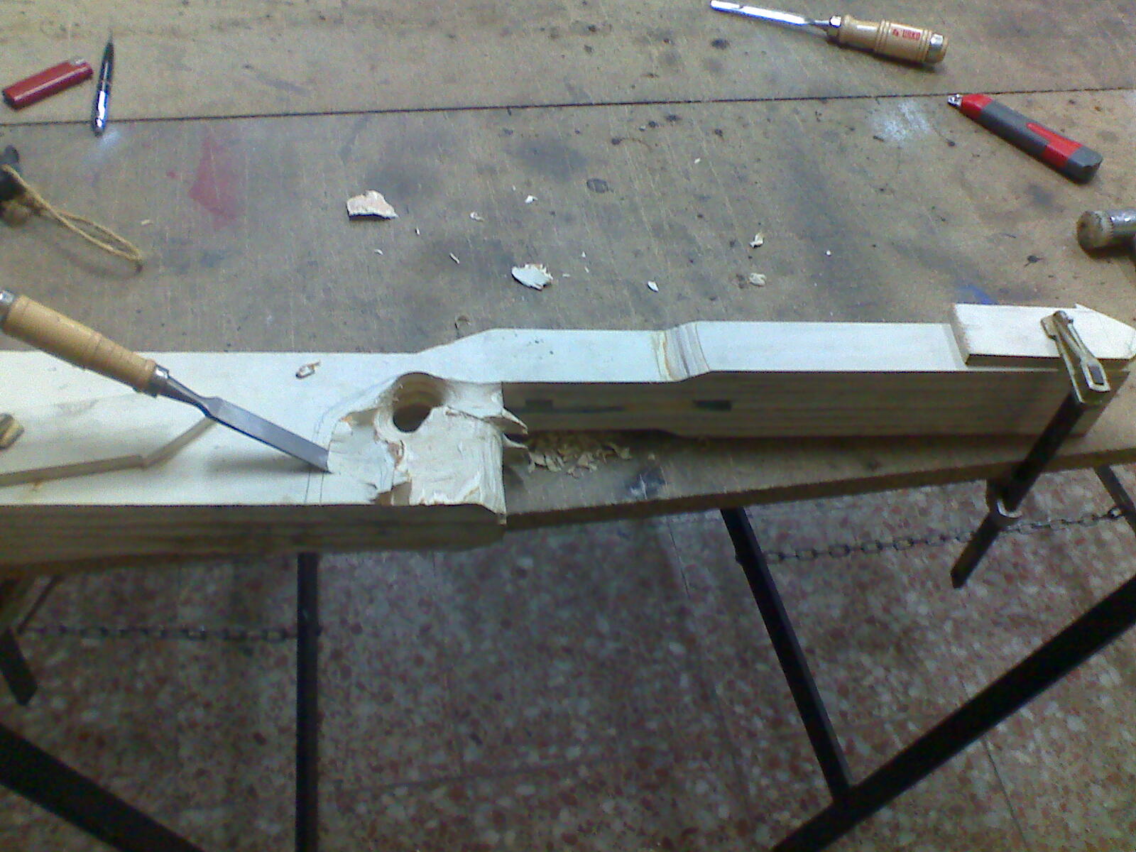Resultó que el contrachapado que me había agenciado para hacer esta carabina tenía un acabado interior peor y con más huecos que el de la otra, así que me vi obligado a utilizar masilla de madera par atapar los agujeros que iban saliendo dentro de algunas chapas.
