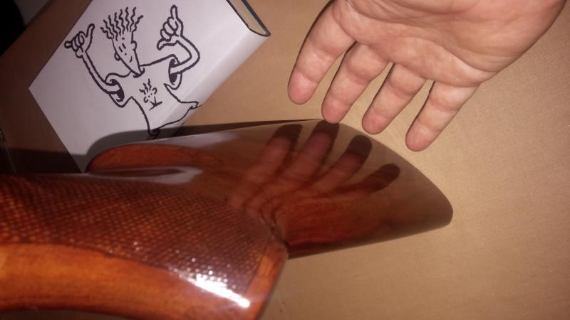 Ahora viene el episodio del tinte. Ha sido la espinita clavada al final de todo. Buscaba un tono rojizo porque me encantan las culatas de algunos rifles y escopetas inglesas. Usé un tinte al disolvente de caoba. No quise arriesgar por evitar que quedara la madera demasiado escandalosa así que lo rebajé al 50%. Después de dos manos con muñequilla me parecía bastante rojo y no quise darle más. Sin embargo, con el paso de los días y tras secarse ya se notaba menos rojo. Al final, tras darle todas las capas de Tru Oil no ha alcanzado el tono colorado que yo buscaba.