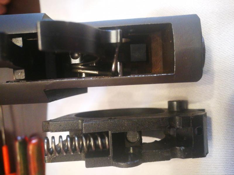 Me he encontrado con un problema a la hora de montarlo. Resulta que el guardamonte del gatillo, que lleva el muelle para la palanca de apertura del cañón, no llega a entrar correctamente hasta alinear los agujeros de los pasadores de retén. Parece ser que tropieza o chicas choca con el muelle del martillo.