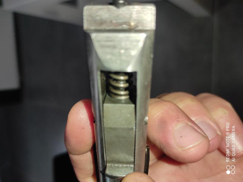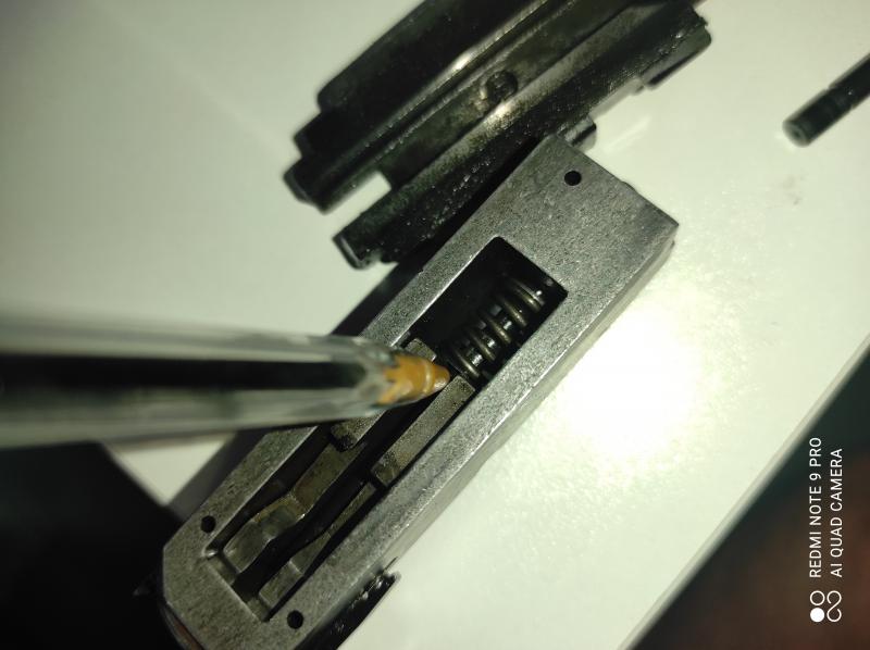 Hola. La zona donde tenía la rebaba está justo donde asienta el muelle, zona señalada con la punta del bolígrafo , que tocaba con un resalte de la aguja percutora al final de su recorrido.