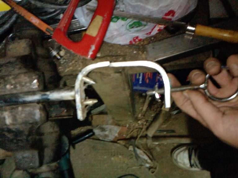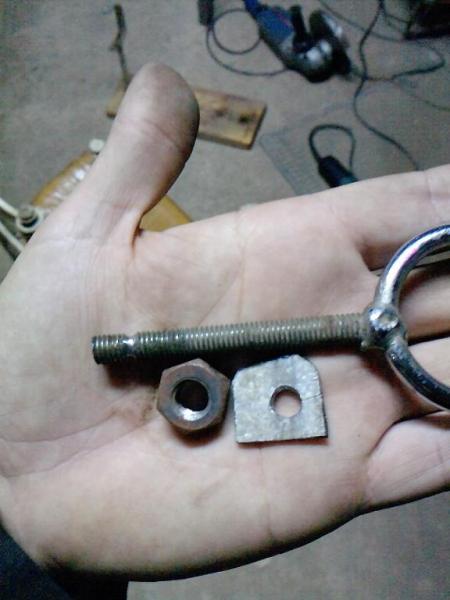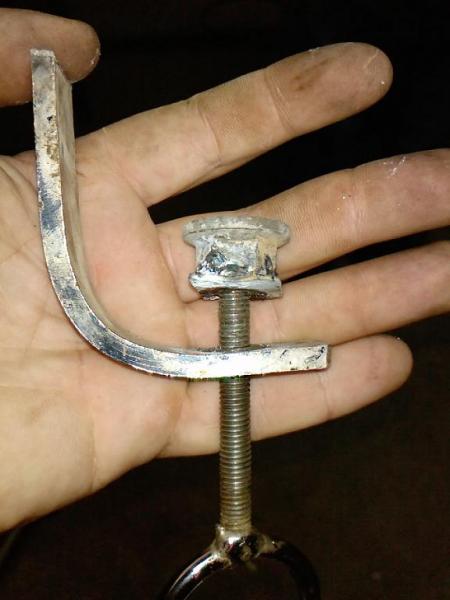 Para fabricar la pieza que sujetara los rifles yo he utilizado partes de un jamonero viejo, en concreto la parte que sujeta la pezuña, esta parte forma una especie de C la he cortado por la mitad quedándome la parte que tiene un tornillo con el cual al girarlo se clava en el jamón, pues bueno, he sacado el tornillo le he quitado la punta afilada y le he hecho una ranura a 1cm del la punta, en la cual introduciré una pequeña pletina con un agujero inferior al diámetro del tornito (para introducir la pletina hay que hacer un corte en uno de los lados para pode abrirla) una vez introducida y cerrada la pletina procederé ha soldar una tuerca de mayor diámetro que el tormillo en la pletina que he colocado, así conseguiré que sea una parte móvil, y que al girar el tornillo para aprisionar el rifle no gira esta parte (como el mecanismo de las sargentas)