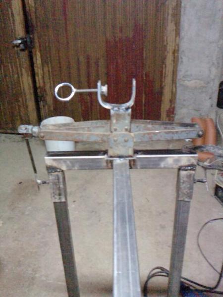 Ahora procederemos a soldar el tubo que sujetara la culata del rifle, este tubo es de 8cm de largo, y yo lo he puesto a 72cm del gato de sujeción (las medidas la saque probando el rifle in situ, y donde mejor quedaba soldé el tubo), y sobre el soldare una especie de V que es donde se apoyara la culata, (esta pieza también es de un jamonero, es la parte que sujeta el muslo del jamón), y a la V le soldare una pletina en forma de L que apoyara en la cantonera del rifle (mejor ver foto)