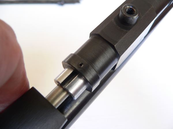 26.- Sólo haciendo coincidir riel del pistón con la espiga guía conseguiremos que el pistón se mueva atrás OJO a esto que es básico e imprescindible para el funcionamiento efectivo y seguro del rifle.