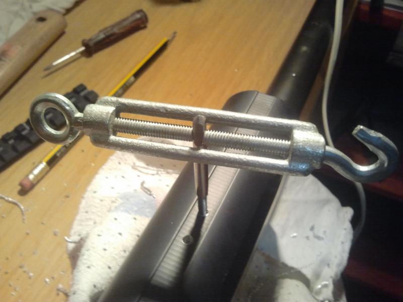 Ahora os mostraré un pequeño apaño que me funcionó de maravilla…acudí a la ferretería y el tendero pudo servirme el juego de los tres formadores de rosca que indicó Dalton pero no le quedaba giramachos alguno (la herramienta soporte donde van alojados para empezar a hacerlos girar manualmente)…con lo cual observando la necesidad se me ocurrió utilizar un tensor común que tenía por casa y que me permitió poder realizar la operación…