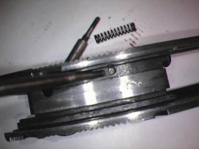 Los cargadores que no tienen tapa inferior, se desmontan comprimiendo el muelle empujando la teja bloqueamos el muelle introduciendo un botador por la ranura inferior y dejando caer la teja sale posteriormente el muelle