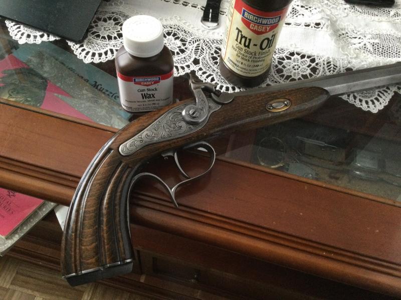 Yo si el arma es fina y brillante le daria Birchwooe casey, y si es mate, acabado de barniz mate, que me lo dieran en cualquier taller que barnizen.