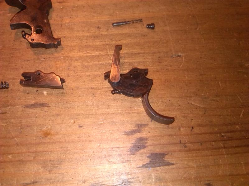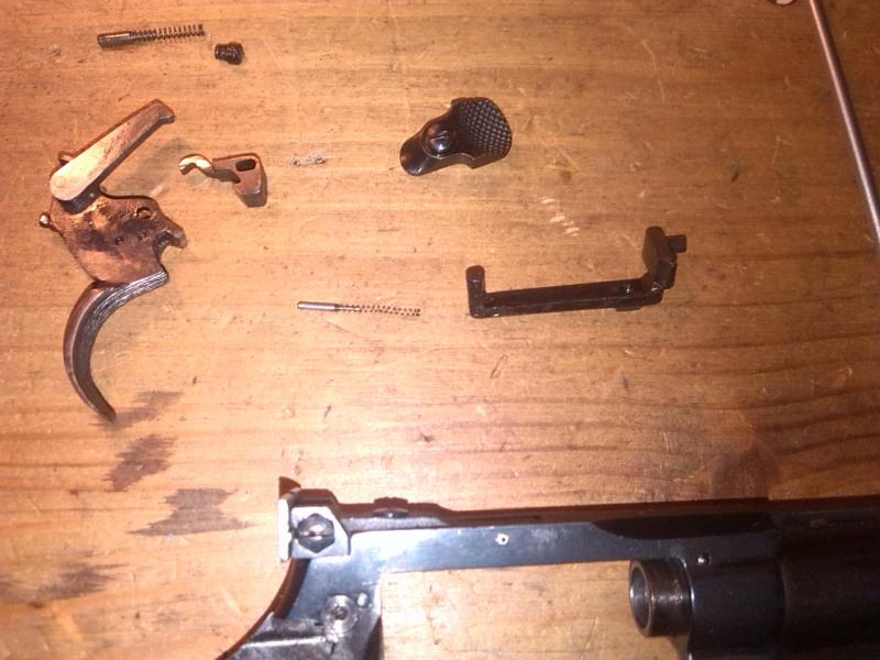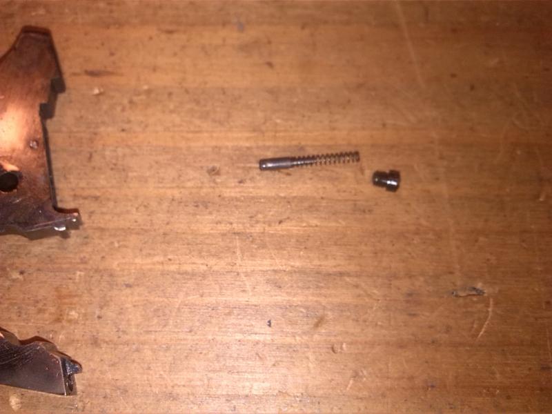 Con un destornillador fino de relojero que introducimos en el muelle de la caja de retorno del disparador hacemos palanca y sacamos la caja y el muelle, el muelle se queda ensartado en el destornillador.