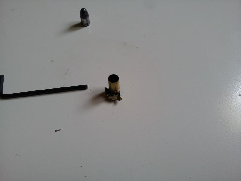 Mi teoria es que hoy fue un mal dia, por un lado algo se jodio en el casette de disparo y de ahi los problemas con el disparador y la segunda cosa es que el arma no quedo completamente cerrojada con lo que al percutir la vaina esta rebento por el culote escapando los gases por detras ,de ahi q la bala no llegara a salir. Pudo ser defecto del laton de la vaina ?