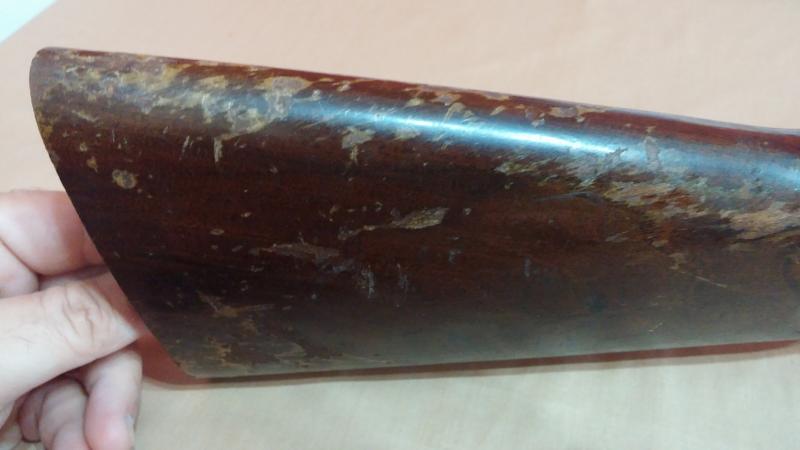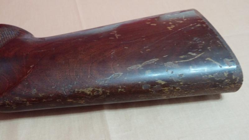 Mecánicamente muy bien pero tenía roña en los cañones para parar un tren. Las maderas estaban fatal: el barniz totalmente desconchado que además oscurecía y tapaba las vetas de la madera. La culata estaba particularmente dañada. Raspones y golpes habían literalmente arrancado algunas partes superficiales de la madera.