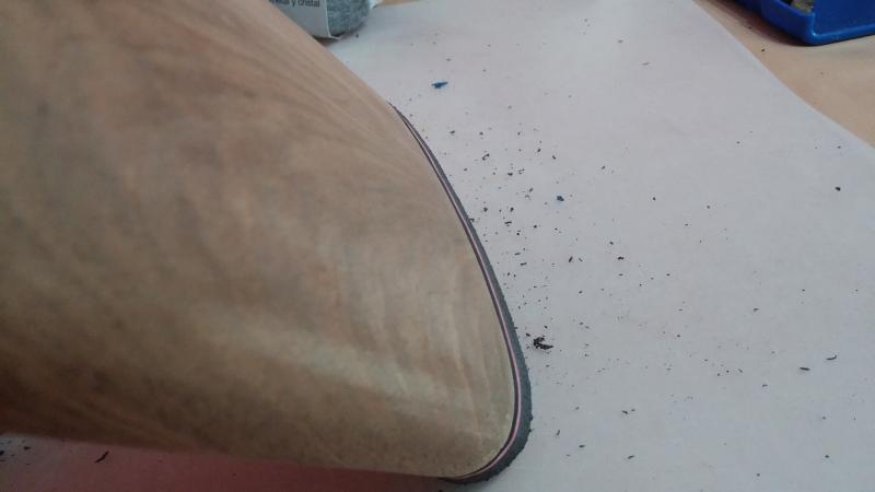 Como podéis ver en esta foto de arriba se me fue la mano con la dremel (se veía venir), así que una vez dejada la cantonera al ras de la madera a mi satisfacción, la quité y le di otra manita de lija a la madera para eliminar el raspón.