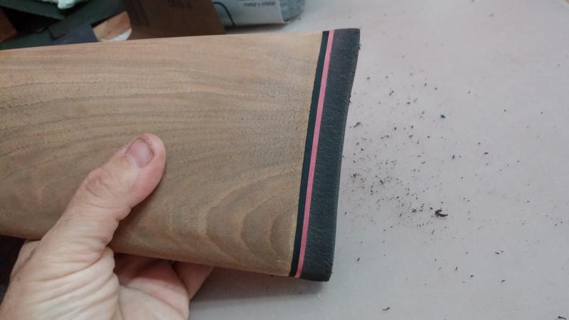 Una vez lijado todo pensé que para un torpe como yo, igual era buena opción meterle mano a espinoso tema de la cantonera en este momento, con la madera "pelada". Os lo explico: las cantoneras suelen ser "universales", esto es, cuando la presentas sobre la culata suelen sobresalir por todos lados ya que tienen un tamaño superior. Ahora llega el reto de lijarla con mucho cuidado hasta dejarla con la medida exacta para que si pasas el dedo no se note el salto de la madera a la goma. Evidentemente hay que ser un fiera para conseguir esta finura (o un profesional, claro). La Dremel hace maravillas pero hay que tener muy buen pulso porque si se te va un poquito y le das a la madera fastidias el barniz o el acabado.