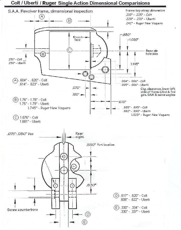Colt / Uberti /Ruger Saa comparación de dimensiones del frame
