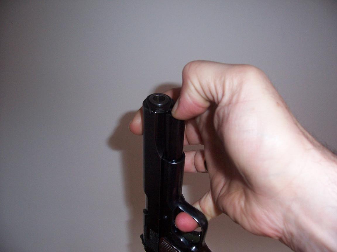 Presionamos el tapón espoleado con el pulgar sosteniendo la pistola por el guardamonte con el meñique.
