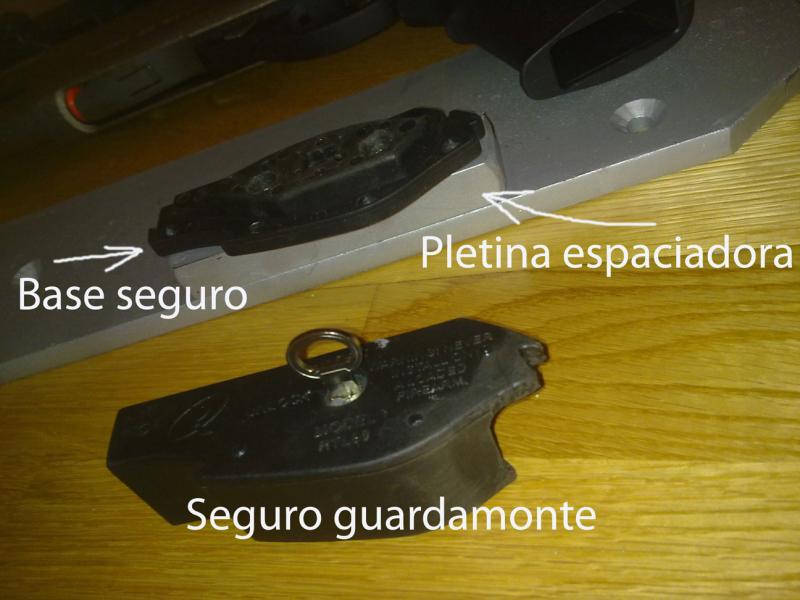 El seguro del guaradmonte, de acero y plástico por el exterior, me vino junto con la escopeta y esta fijado a la base "pletina" soldada, con unos tornillos allen gorditos, asi que es muy resistente a los tirones. El candado superior refuerza el arma al conjunto muy firmemente. Puedes bloquear el arma con el candado solo, con el seguro guardamontes solo y con ambos al mismo tiempo.
