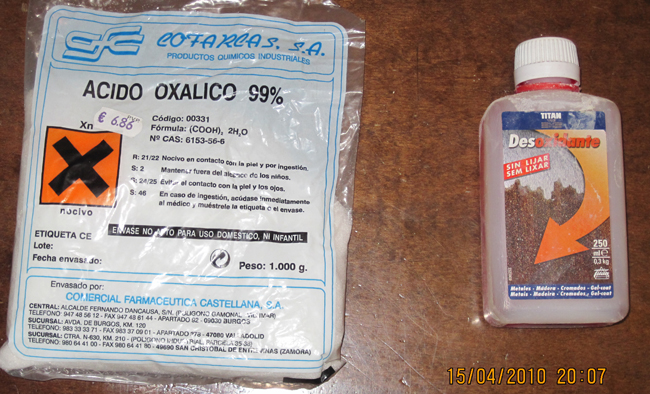 Kar98m48,te pongo una foto de los desoxidantes que uso, lo cual no quiere decir que sean mejores, son los que encuentro en mi zona. Tengo noticias de la marca “Ferronet”, pero no he podido encontrarlo. El de Titán no tienes mas que seguir las instrucciones; el otro, que es el mas económico, lo preparas disolviéndolo en agua al 10 % y sumergiendo las piezas en esta solución. No se porque pero en algunas se quita rápido y en otras…horas. Cuando se quita el oxido quedan de un color grisáceo que se quita con lana de acero o lija muy fina.