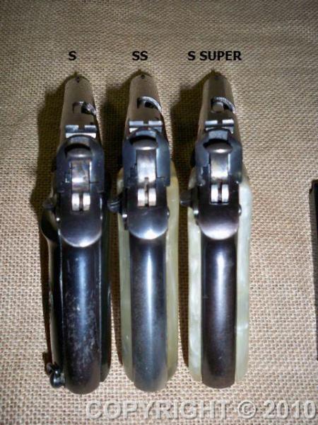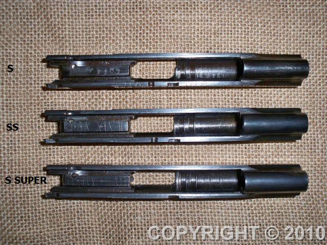 La S SUPER presenta indicador de carga y pese a la similitud de las 3 correderas las de las S y SS no admiten el cañón de la S SUPER,no puede llegar a ser introducido. Al revés, es decir los cañones de las S y SS, aunque llegan a entrar en la corredera de la S SUPER no acerrojan. No lo he medido pero aparentemente ha de ser por pequeñas diferencias pues "a ojo" no aprecio tal diferencia. Las correderas "desnudas" pueden colocarse entre todos los modelos pero solo pueden intercambiarse plenamente en el caso ya indicado.