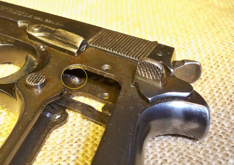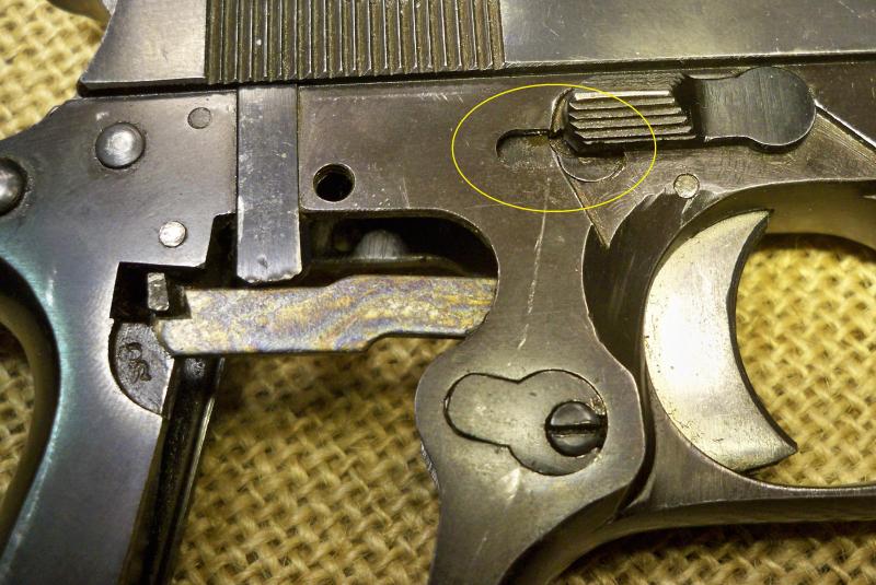 Exteriormente se puede ver dicho trinquete desde la parte derecha del arma, justo bajo la palanca de desmontaje. La propia palanca tapa parte de la misma, que lleva un pasador con cabeza de tornillo plano que con un cuarto de vuelta libera dicha pieza y permite su extracción.