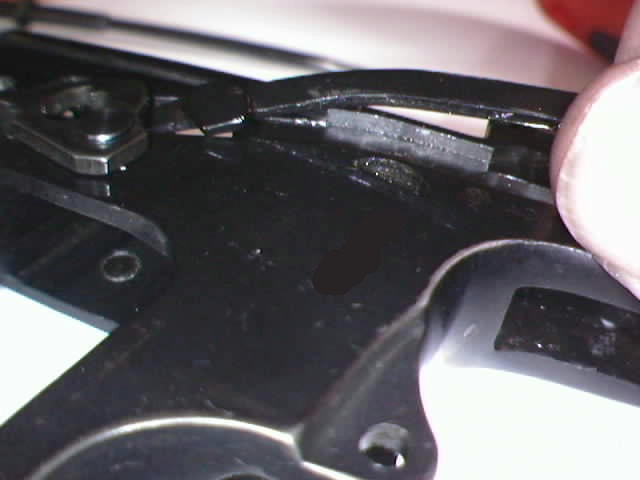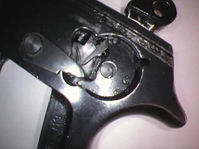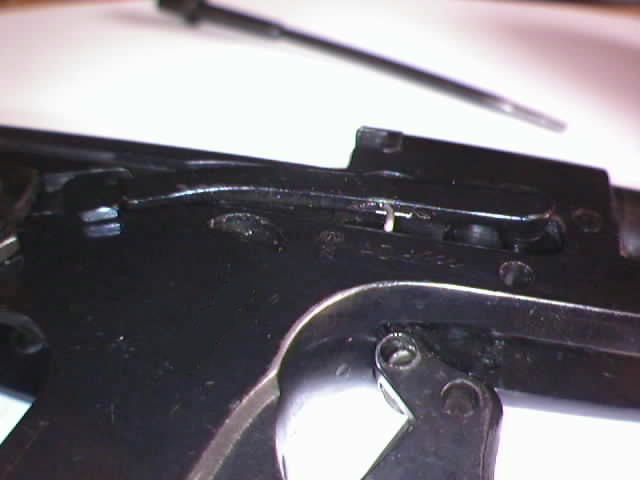 Empujamos la biela de disparo y el disparador todo lo que podamos hacia adelante, comprimiendo el muelle del seguro de aguja, giramos el disparador hacia la izquierda y sacamos la biela del alojamiento en el armazón, hasta que el disparador se desenganche del eje de la biela y el muelle del disparador se suelte de la ranura de la biela.