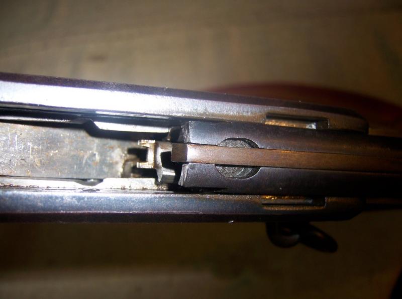 Cuando la he desmontado, para arreglar la percutora, me doy cuenta de que el tope expulsor, el que lleva el muelle, no queda rasante con la cabeza de cierre, y cuando se le fuerza para que quede rasante, queda encastrado en el cierre.