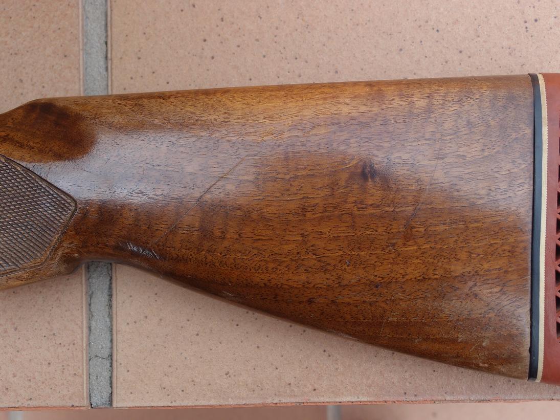 Debes de evitar que, al ponerle la cantonera, te lo haga un manazas como el que me lo hizo a mí (Ya lo hago yo siempre) pues como puedes apreciar, lo igualó a máquina sin proteger la madera, y tocó a altas revoluciones el borde de la misma. Lo que debes de ahacer es conservar la cantonera antigua, lijarla al mismo tiempo que la culata, y luego , cuando la pulimentes con el disco al final, hacerlo también con ella. Si comparas el trabajo de las cantoneras de la Grulla, con la del 222, no adivinarías que las tres cantoneras Holland eran idénticas, antes de ponerlas.