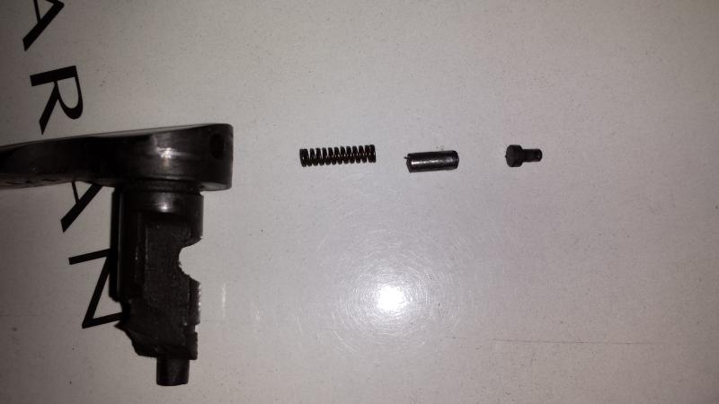 Luego quite el tornillo de la ballesta muelle y pasador que sujeta la tecla del seguro.