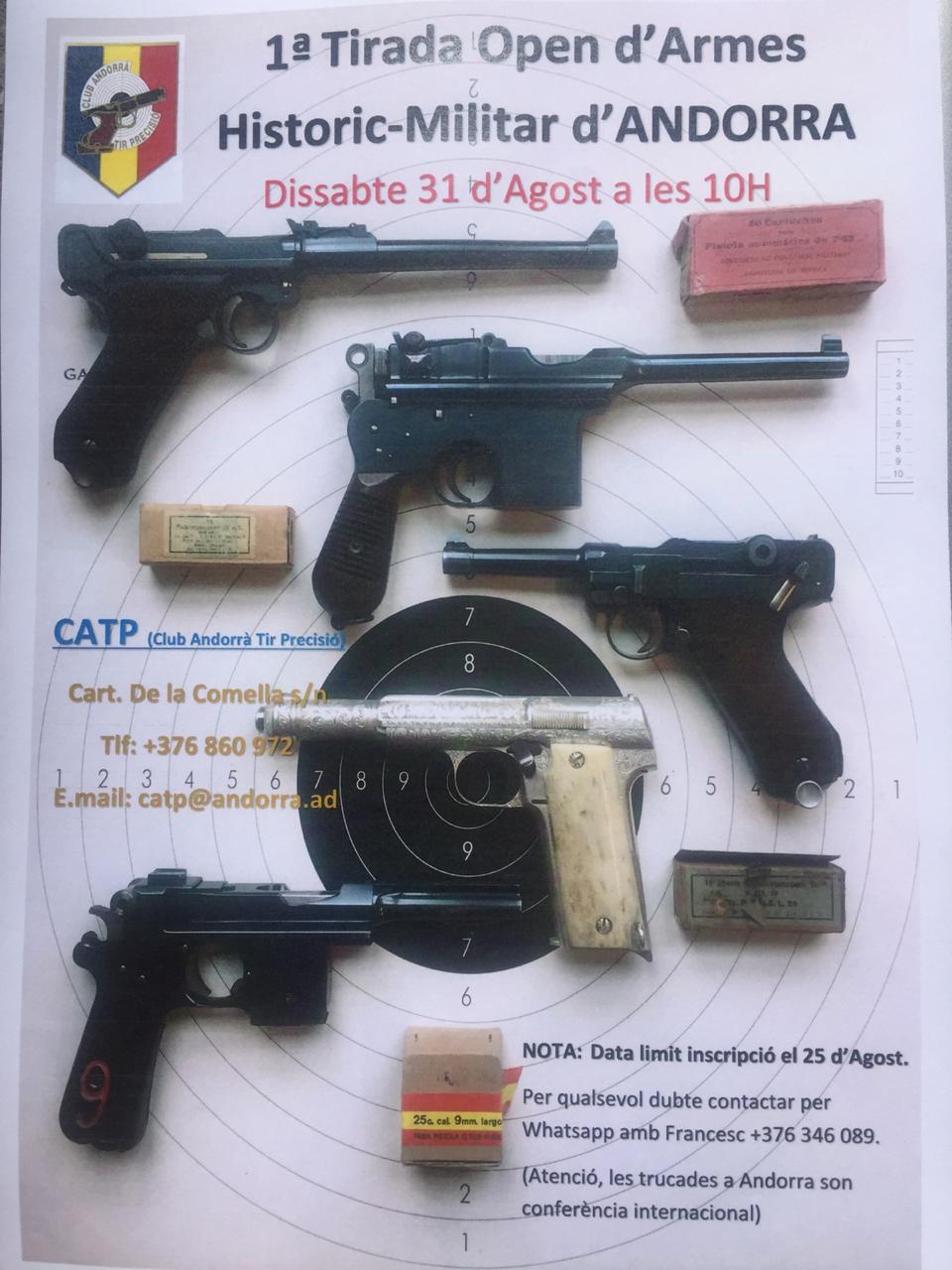 Hola a todos, os quería informar de la Tirada de pistola Historico-Militares que hemos organizado en nuestro Club del Principado de Andorra por si alguno de vosotros se anima a participar y de paso hace una escapada con vuestra familia a nuestro Valle Pirenaico.