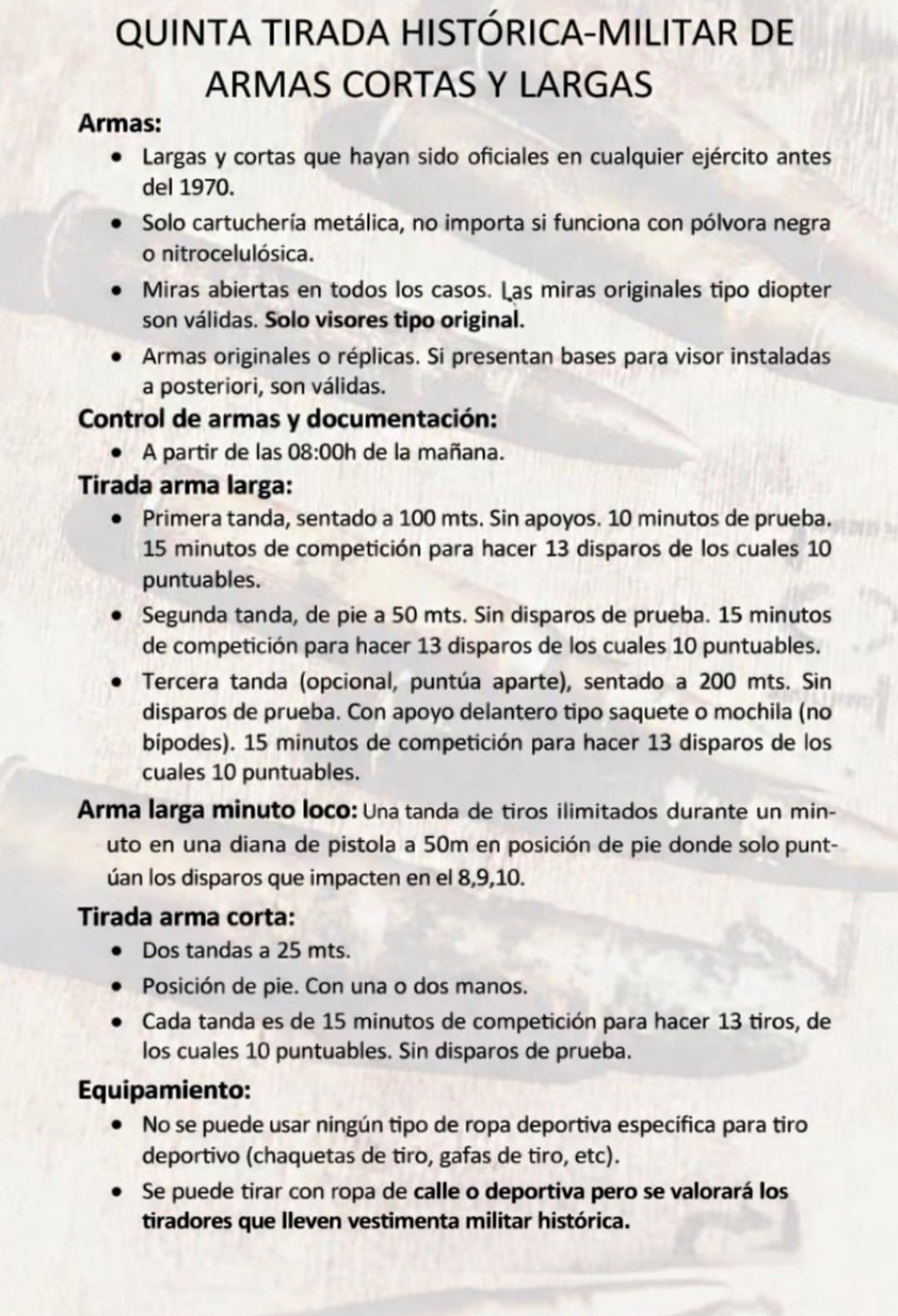No tengo claro como lo planeáis para la tirada arma corta... creo serian mejor 20 o 30 tiros a precisión en tandas de 5 tiros en 5 minutos... y a una sola mano. Y puestos a valorar... daría puntos extra a las valiosas rarezas, aunque entiendo eso es complicado pues una persona se tendría que ocupar de eso con cierta responsabilidad y mostrando un baremo aproximado antes de la tirada.
