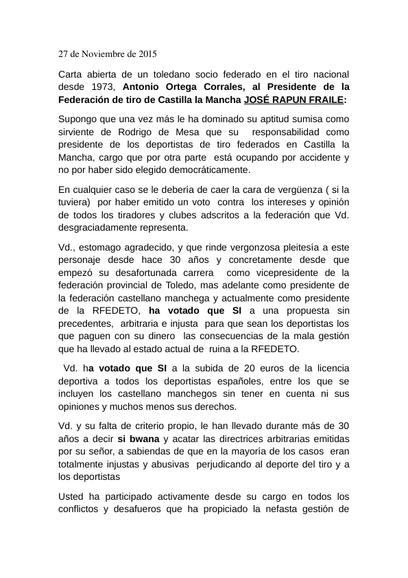 Aprovechamos para enviarles una carta abierta de un socio Veterano de Toledo al Presidente de la Federación de Castilla la Mancha Sr Rapun, precisamente uno de los que voto si a la propuesta.