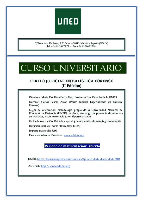 Re: II PROMOCION UNED PERITOS JUDICIALES EN BALISTICA FORENS