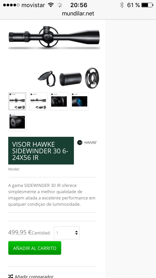 sin animo de crear polemica pero no se donde esta ese incremento de precio,yo compre el 23/02/2015 en mundilar un hawke sidewinder 30 sf 8-32x56 half mildot x20 con tapas metalicas y me costo 368,95 € + 9,95 de porte total 378,90 puesto en casa.el 6-24 x56 es mas barato. y pregunto , donde esta justificada esa subida de precio.