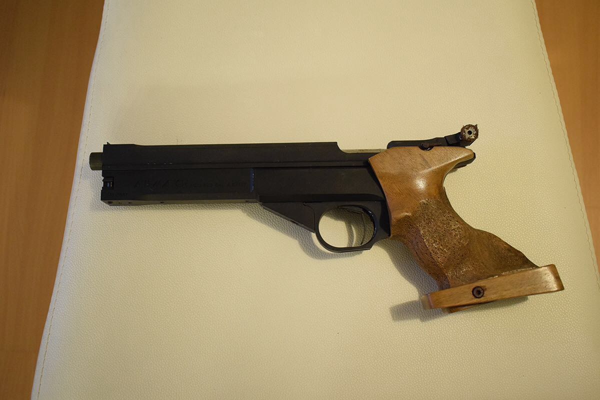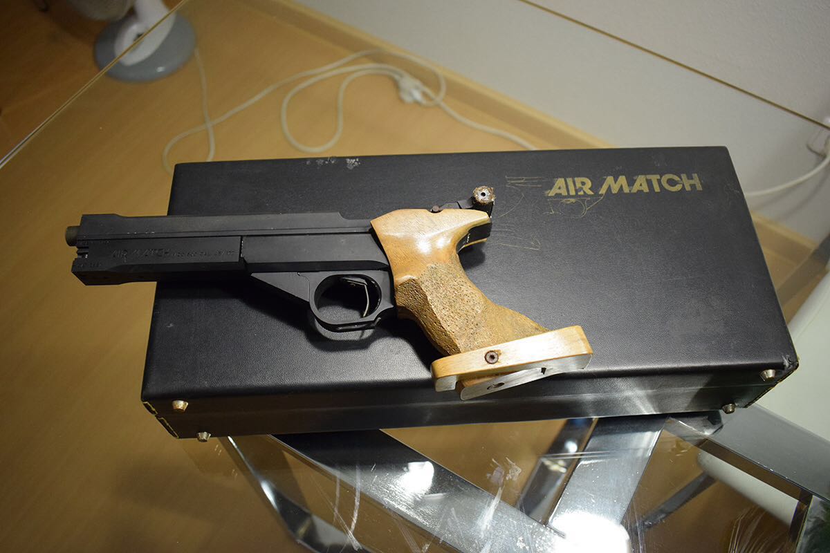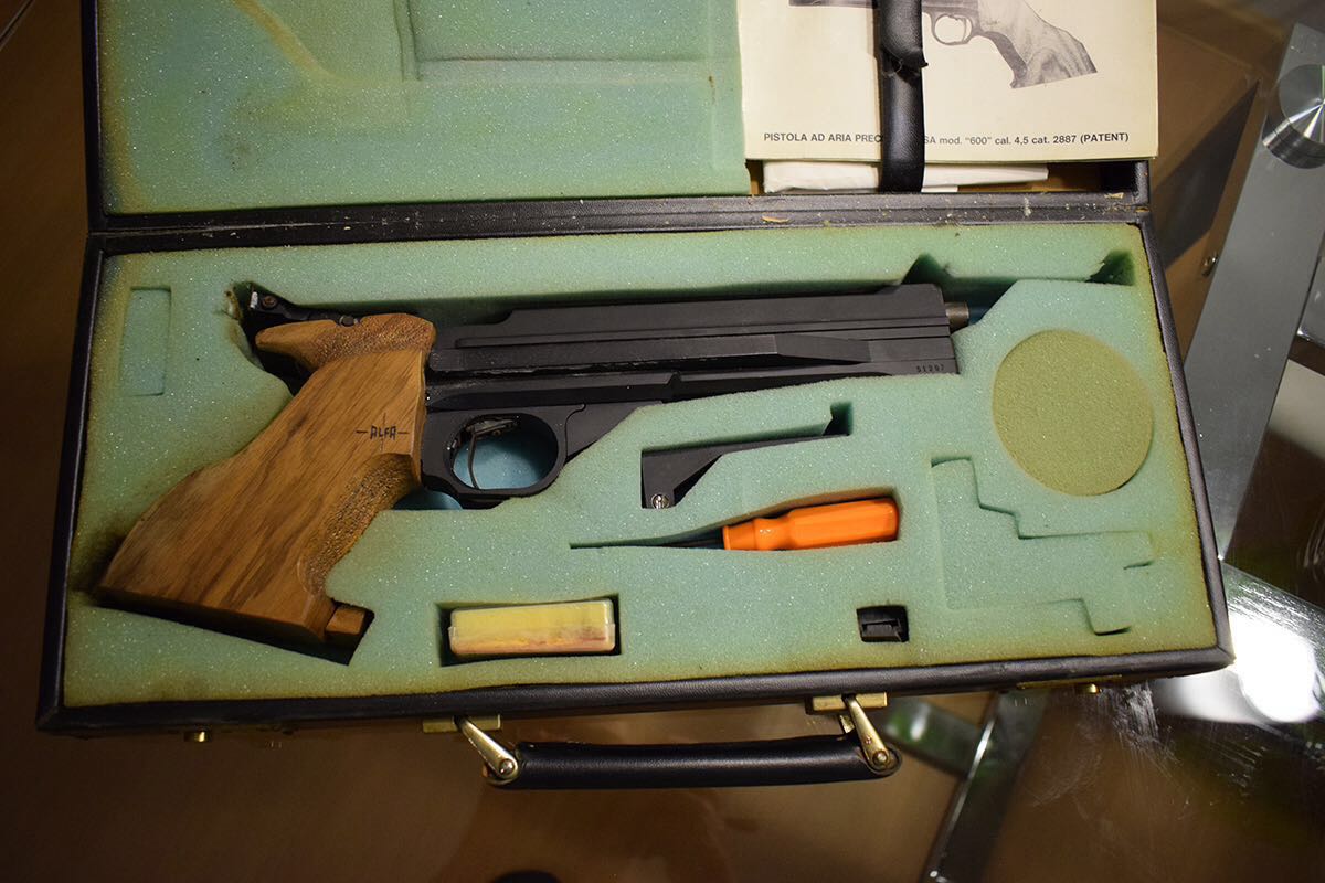La pistola procede de herencia, tiene sus años ya. Esteticamente esta en muy buen estado. Viene con su maletín, accesorios, contrapesos, herramientas de ajuste e instrucciones. Mecanicamente al amartillar pierde el aire,habria que cambiar las toricas interiores, por lo que he leido e muy común en estos modelos.