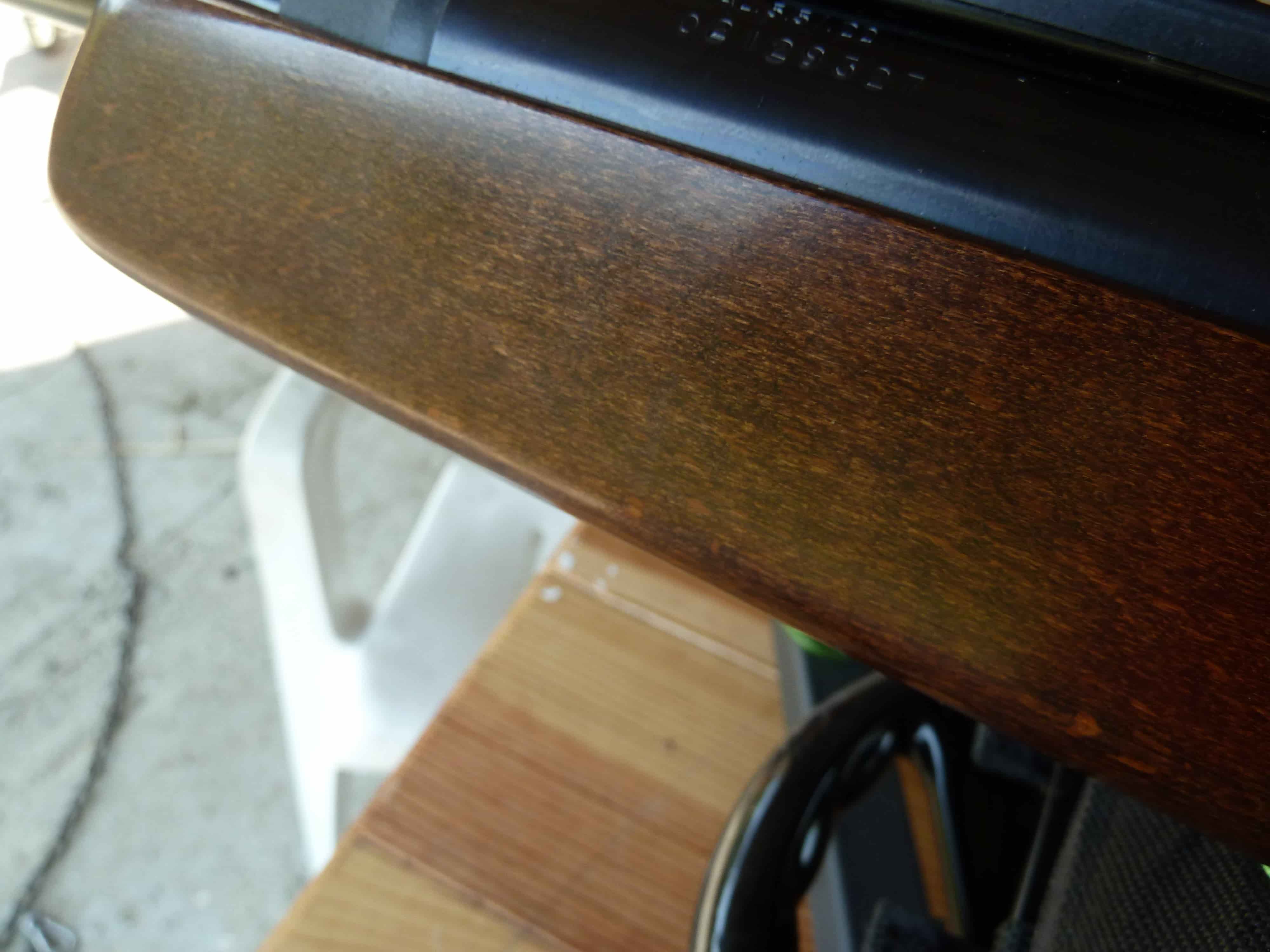 Tiene una pequeña marca en la parte delantera por abajo de la culata que por mas fotos que le hago no sale ya que ni siquiera ha saltado el barniz.