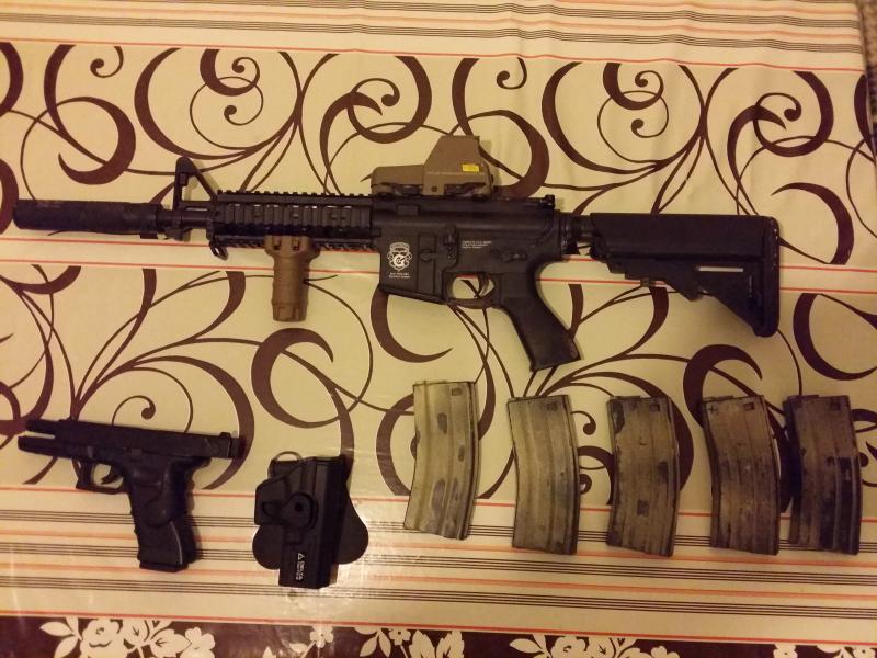 vendo mi m4 de g&g con algunos extras como el motor de altas revoluciones goma del hop-up magpul cañon de precision magpul 02 bateria de lipo silenciador, empuñadura magpul y holografico aunque el holografico no enciende lo vendo por dejar el airsoft, la replica dispara increiblemente rapido. 175 euros.