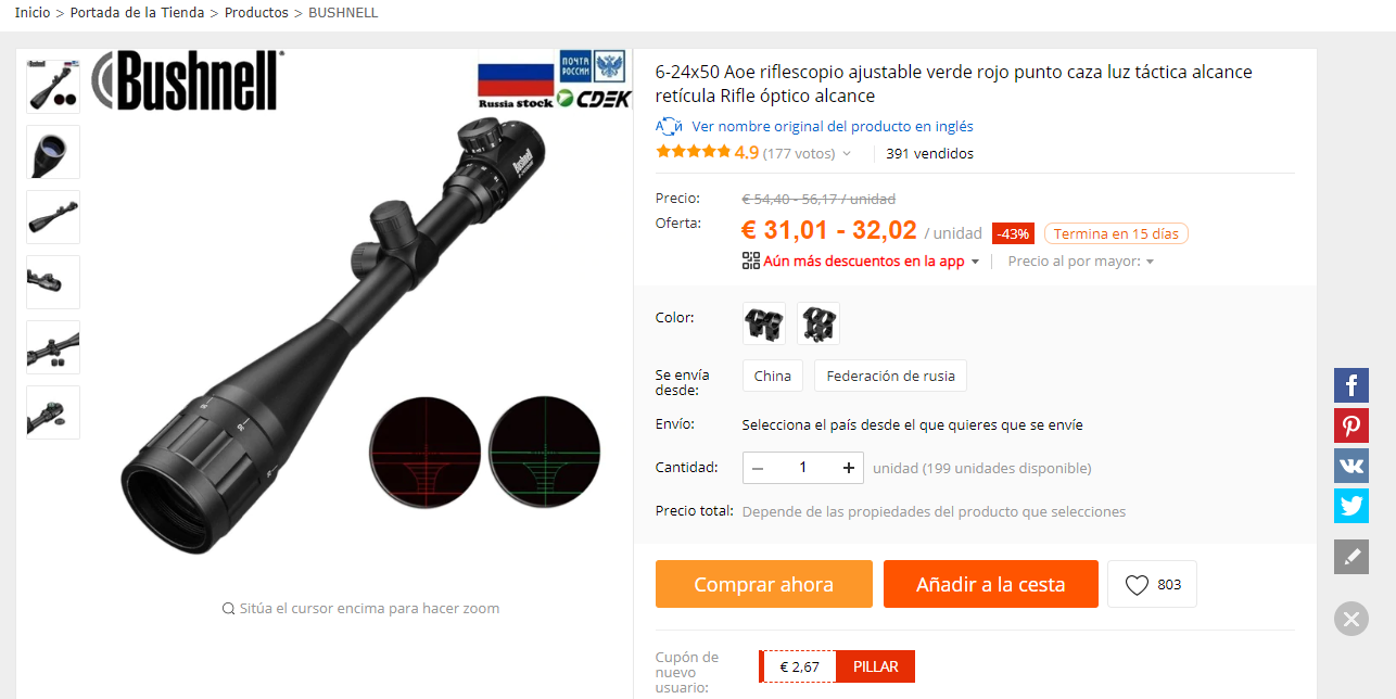 Lamento darte malas noticias, pero, ese visor Bushnell, no es autentico, es una imitación china en toda regla, que puedes comprar en Aliexpress desde poco mas de 30 €, anillas incluidas. El original, es de objetivo de 40 mm, y no tiene retícula iluminada........
