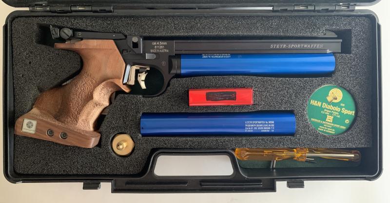 La pistola está en perfecto estado de conservación y mantenimiento y se entrega en su maletín original, herramientas de origen, adaptador para carga de aire y cinco cargadores (Uno para tiro en seco, dos de un solo disparo y dos de cinco disparos).