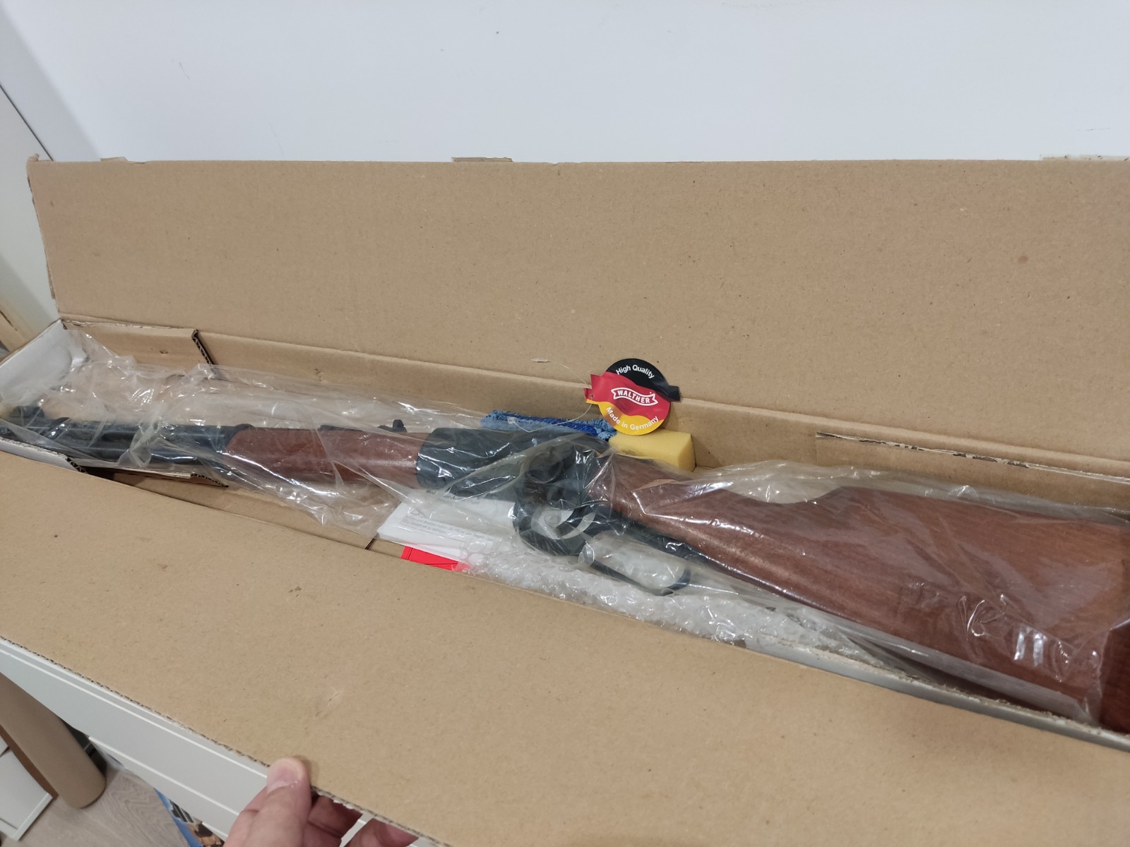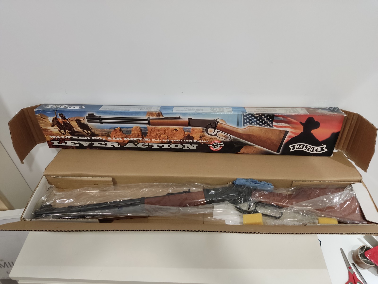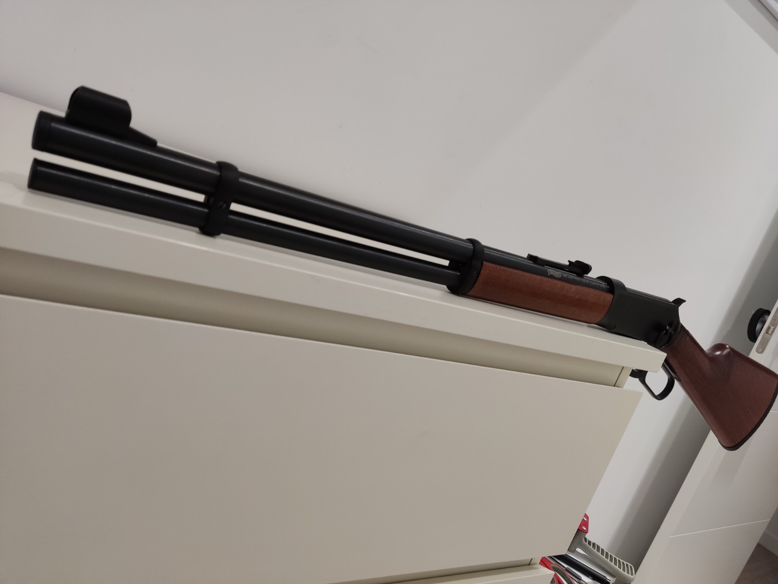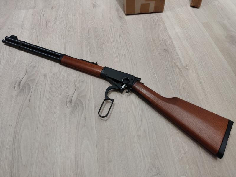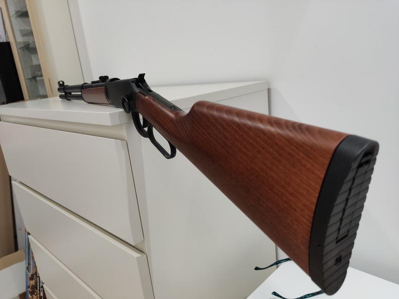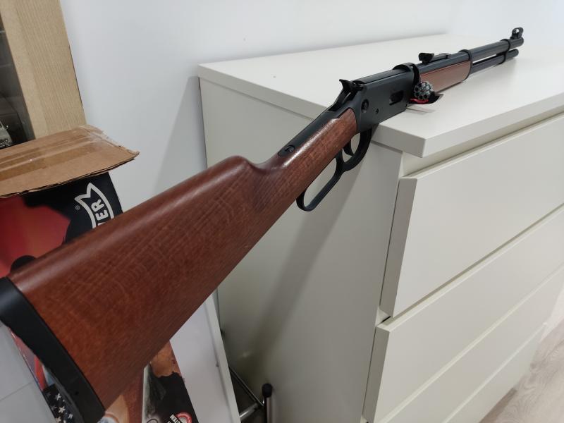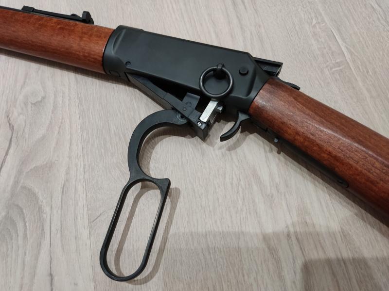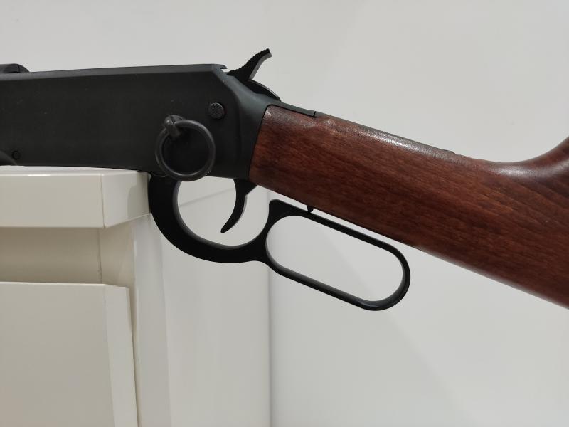 Continuando con la apertura de una serie de hilos para la venta de todo lo que me queda, os presento lo que para mí, es otra auténtica maravilla. Ésta es una fiel réplica del legendario Winchester de palanca, fusil diseñado por Oliver Winchester en 1873 (creo que el modelo en venta se parece más al de 1894), y participó en la guerra del Pacífico, en la 1ª guerra mundial, y en la revolución mexicana. Versatilidad, tamaño, manejo, rapidez de uso y belleza de este diseño, hicieron posible su larga vida. Más famoso si cabe, lo hicieron las películas western de los años 30 y 40, de la mano de John Wayne.
