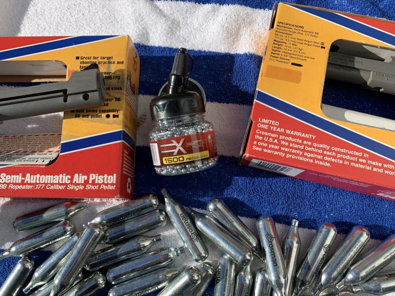 Hola, pongo a la venta dos pistolas co2 crosman airguns, el estado es nuevo. lo que falla es el sistema estanco de retencion de aire de las botellas de co2, por lo demás esta perfectas, por si alguien tiene recambios y las puede aprobechar, ademas añado 49 botellas 12gr de c02, bote 1500 bolas acero y caja de balines gamo. precio por todo 65