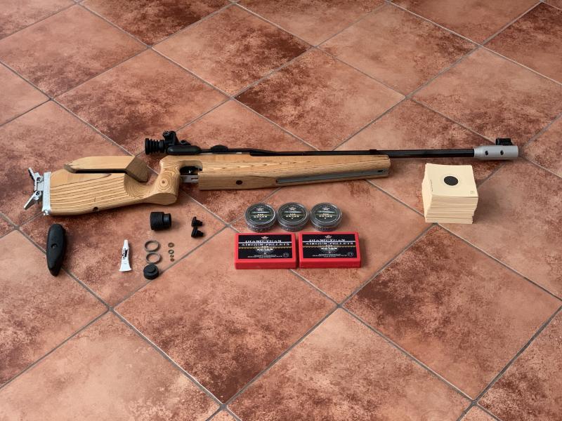 Cañon fijo, sistema de carga por palanca lateral, incluye tunel, diopter, cantonera MEC y la original, balines de competicion y dianas oficiales