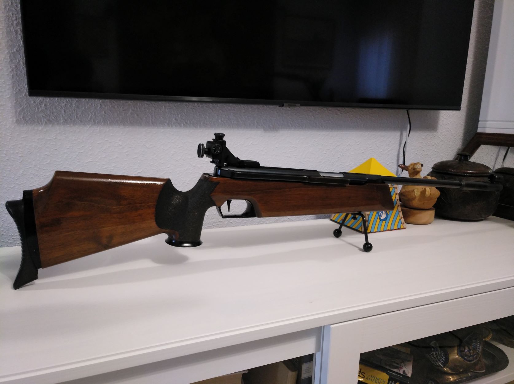 Feinwerkbau 300s, la carabina se encuentra en buen estado general, con claros signos de uso tanto en acción como en culata, el pavonado esta "enmarronecido", la culata presenta algunas marcas pero todas superficiales ........sin grietas ni golpes.