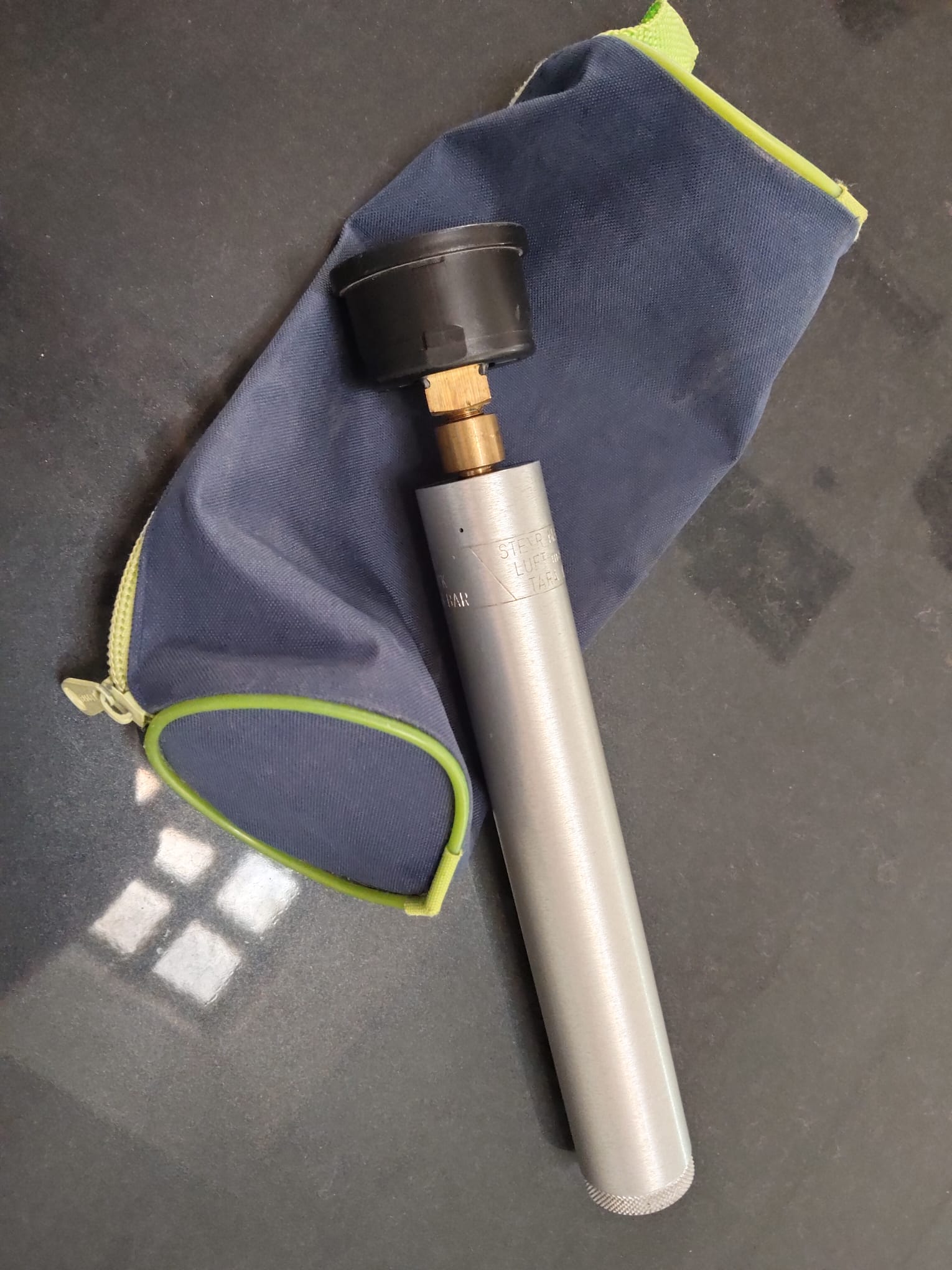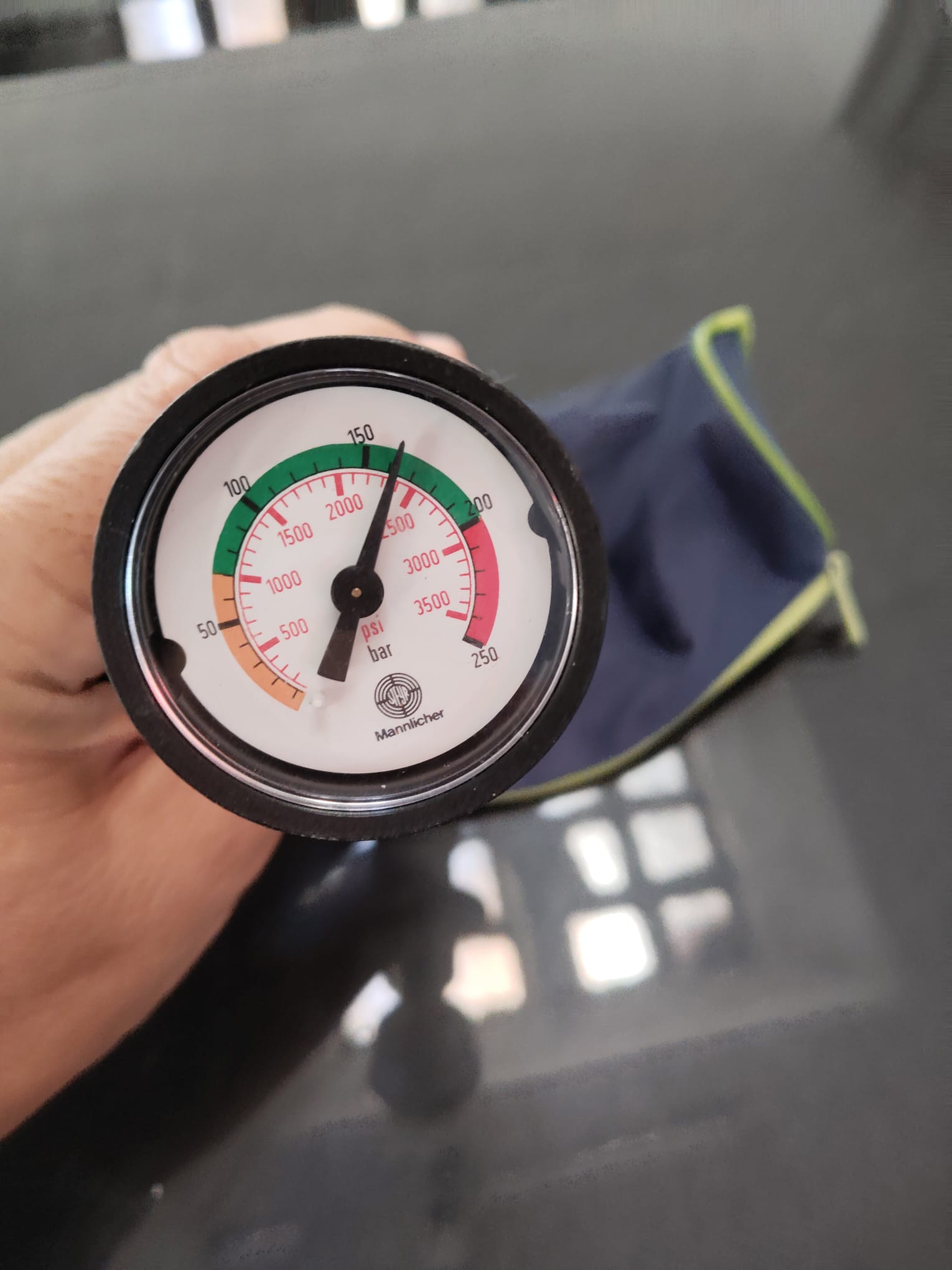 Pistola Steyr LP10 con 3 depósitos, uno de ellos con manómentro, los otros 2 no llevan; se comprueba con un manómetro externo.