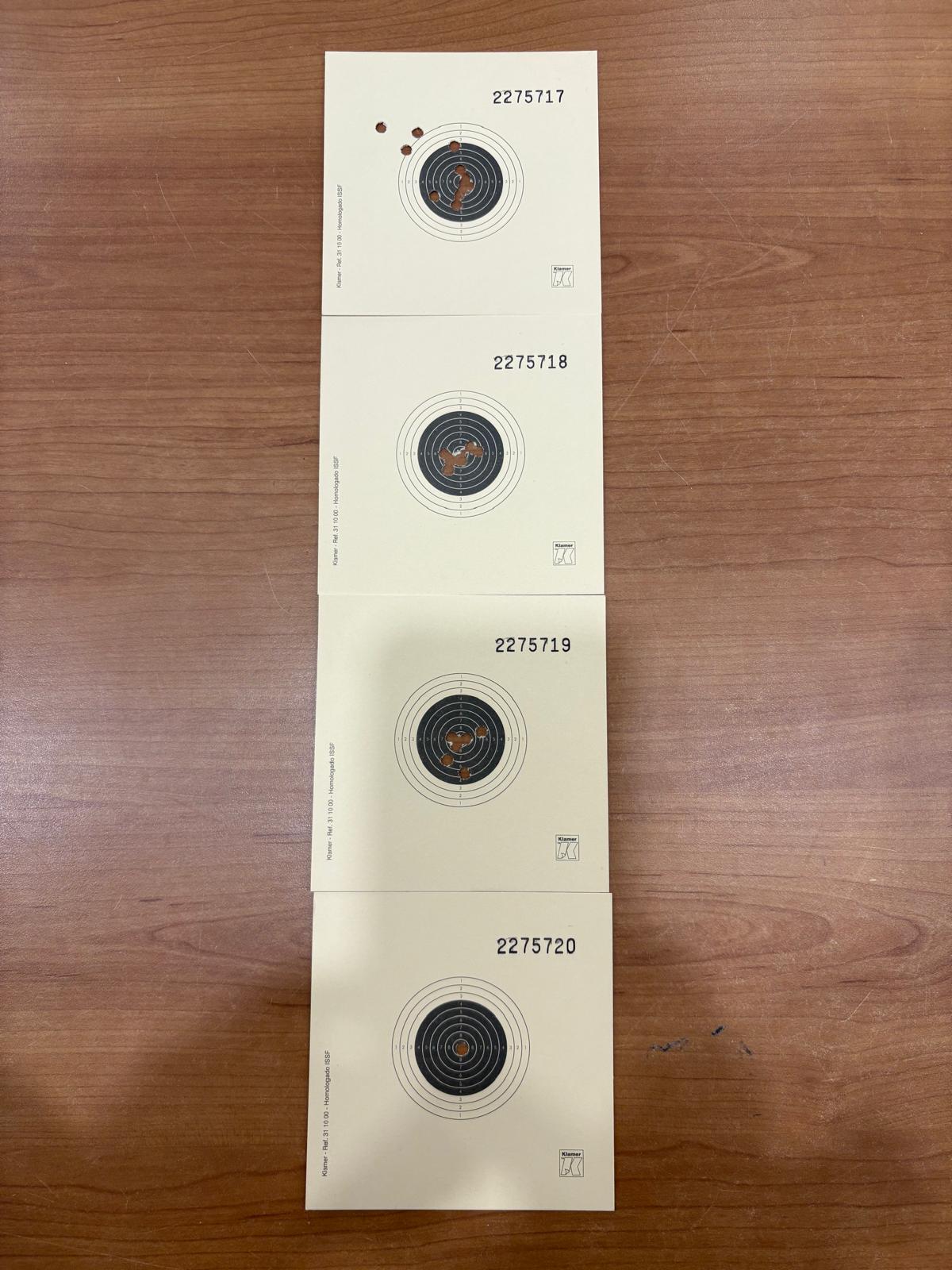 Muchas gracias por la carabina y por la atención y el trato recibido por tu parte Gancha. Está en un estado excelente, como nueva, y ya le he probado. Las fotos son los primeros blancos a 10m tirando sin apoyar. No tardé mucho en ajustar el diopter al centro.