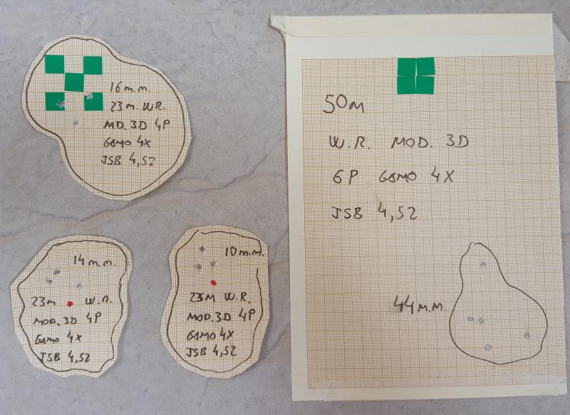 Como veis a 23m la mejor agrupacion 10 mm, y a 50 m han sido 44mm. El tiro de arriba fue el primero y creo que me precipite .... pero bueno, no me quiero flipar mucho. Apoyo trasero saquete y delantero bipode de fclass pero solo apoyado, sin enganchar logicamente.